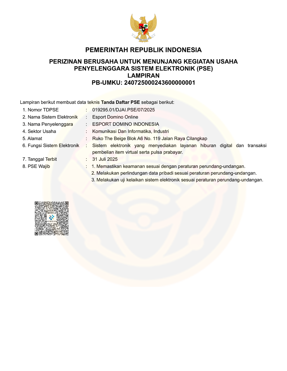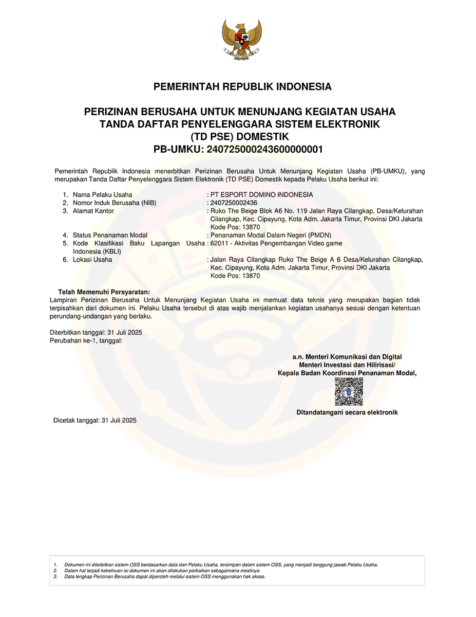 - Legalitas perusahaan : PT eSport Domino Indonesia